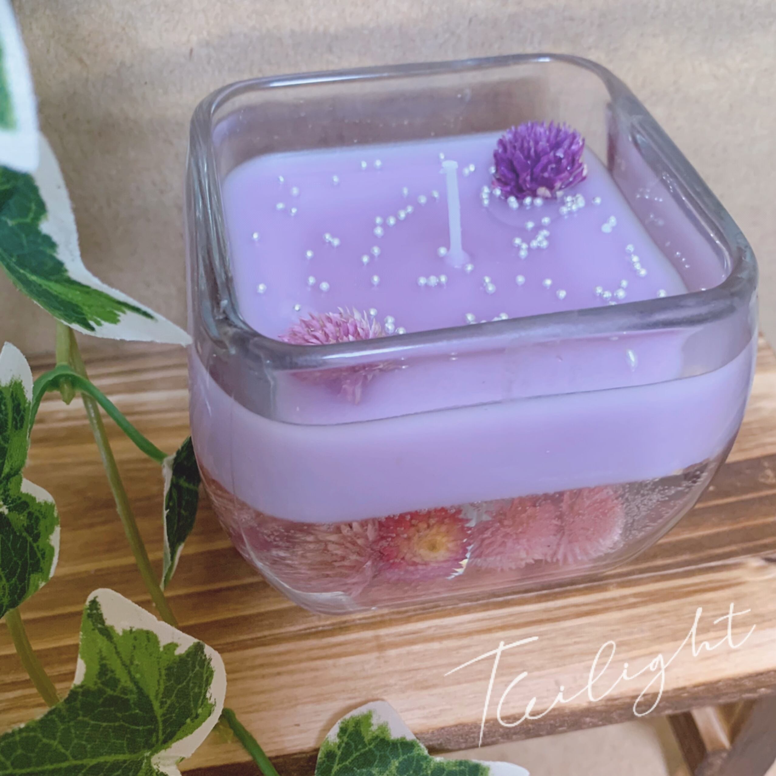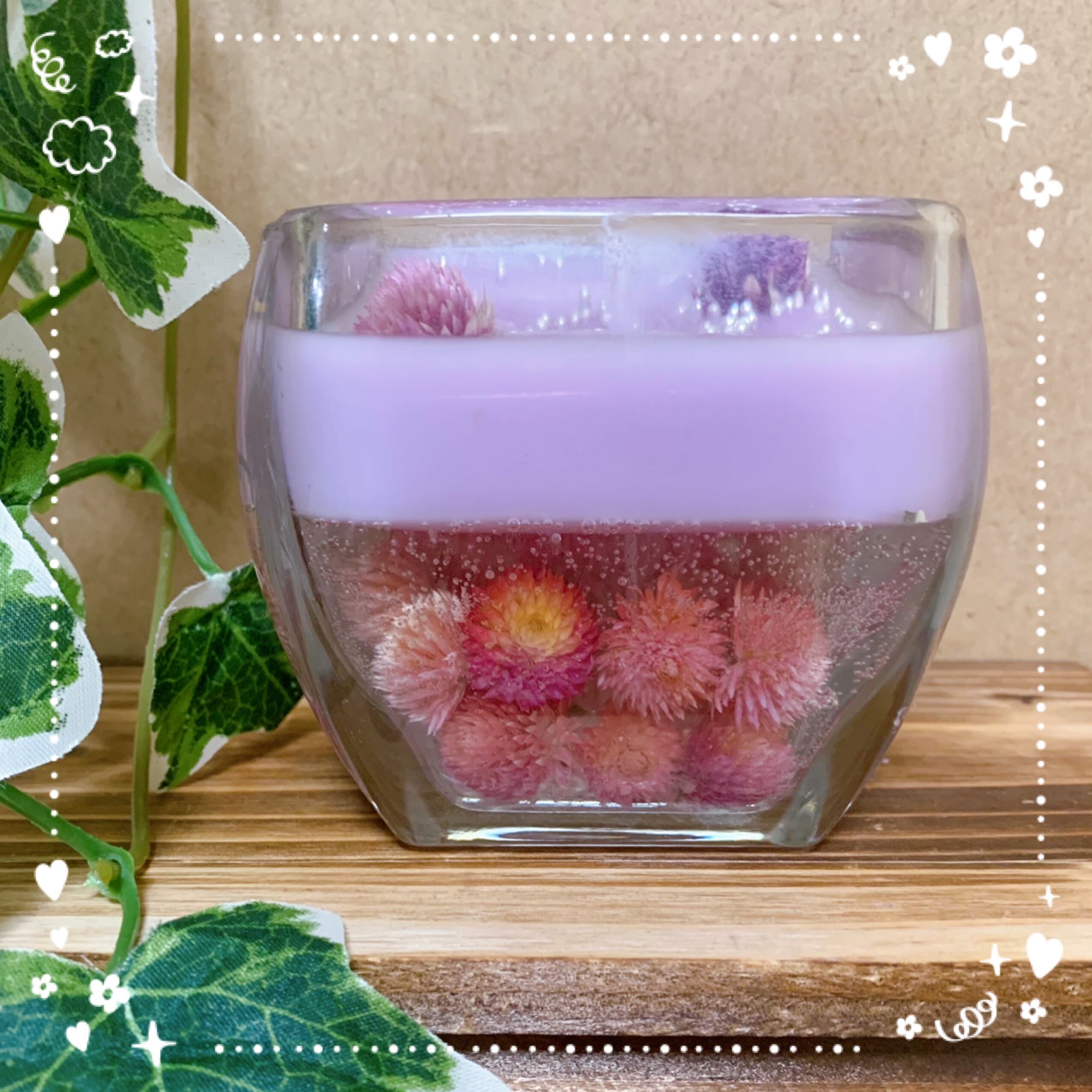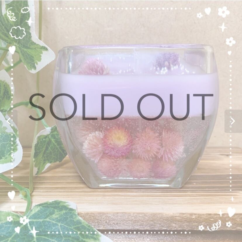 ラベンダー×ジェルキャンドル。千日紅を上面と底部にあしらったデザインになっております。