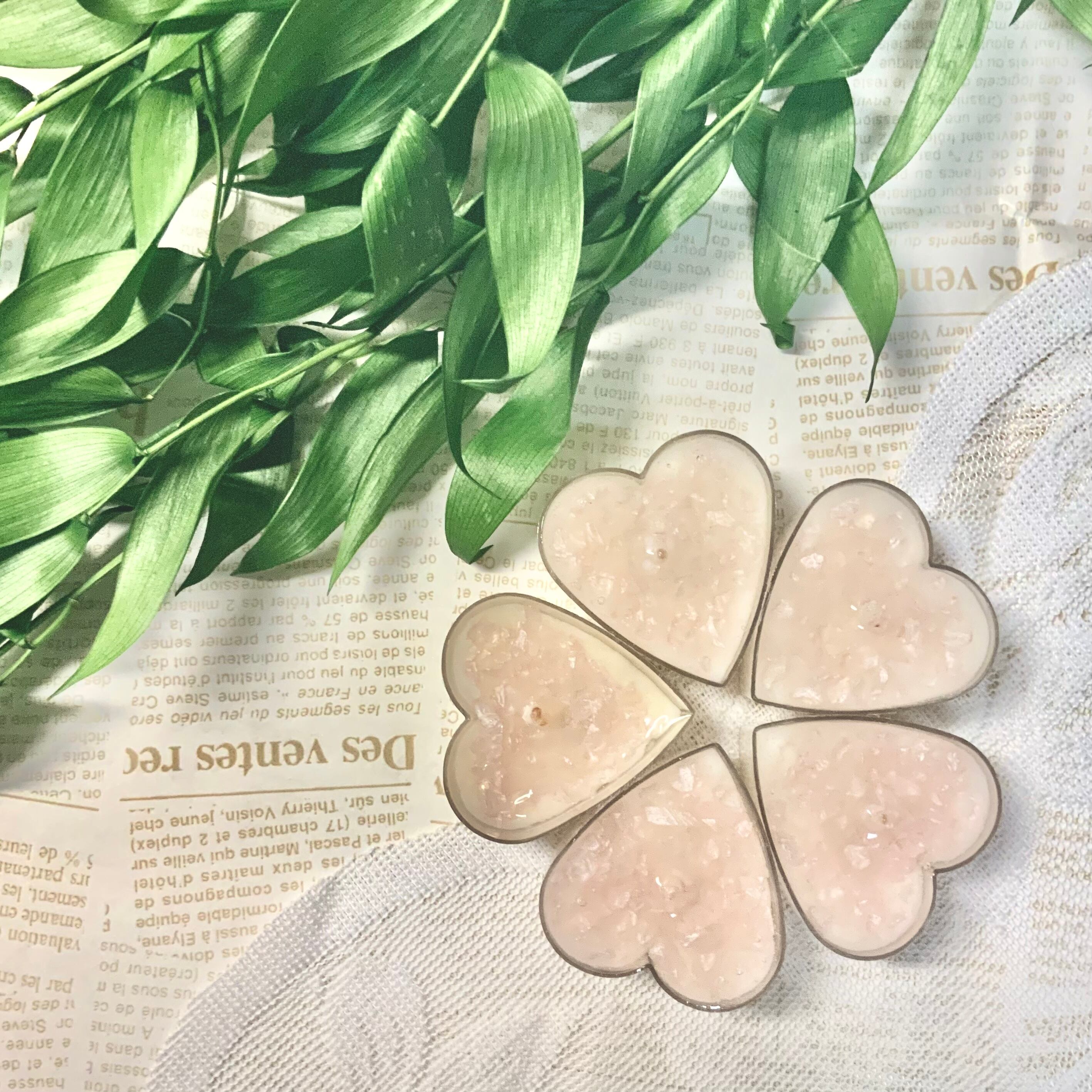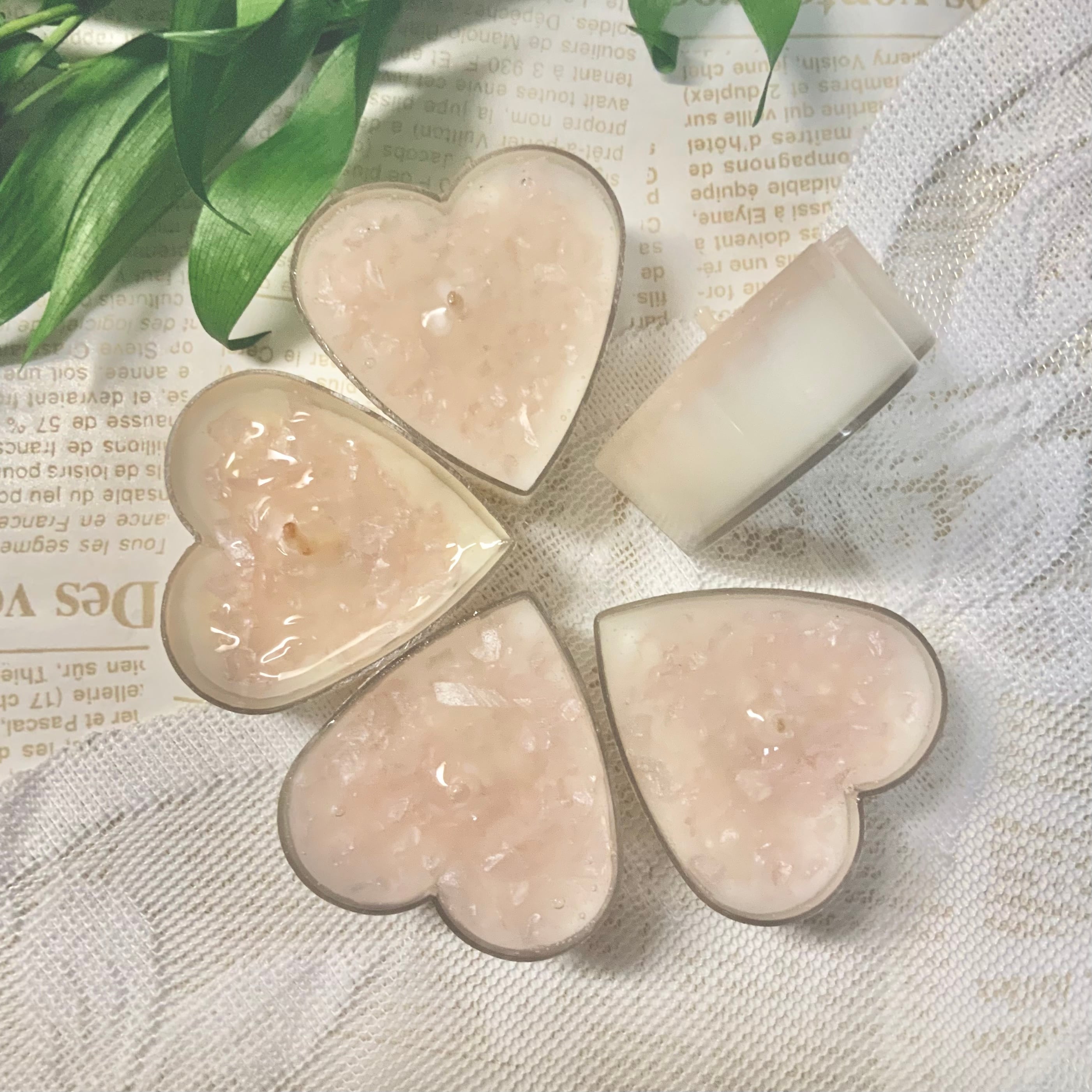 透明なジェルとソイワックスの2層で、間にピンクのガラスサンドを散らしています。